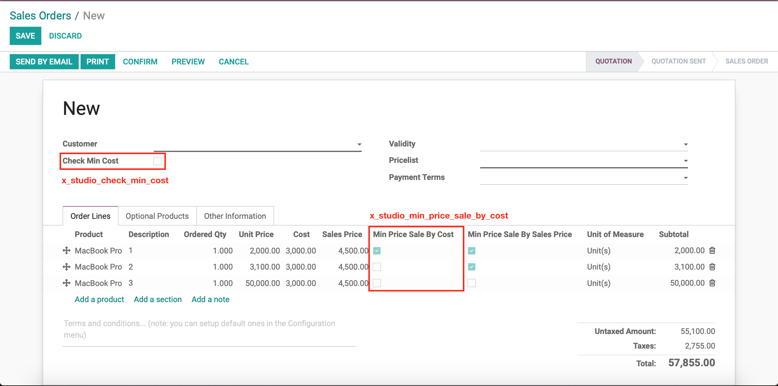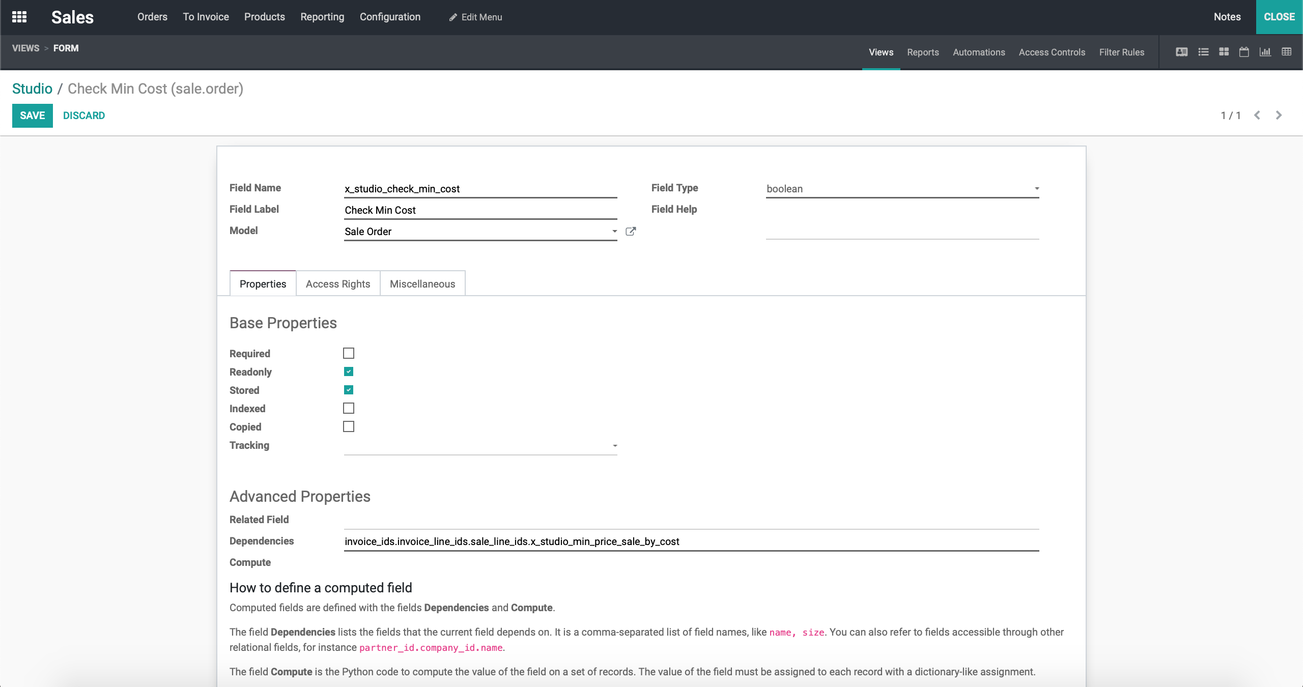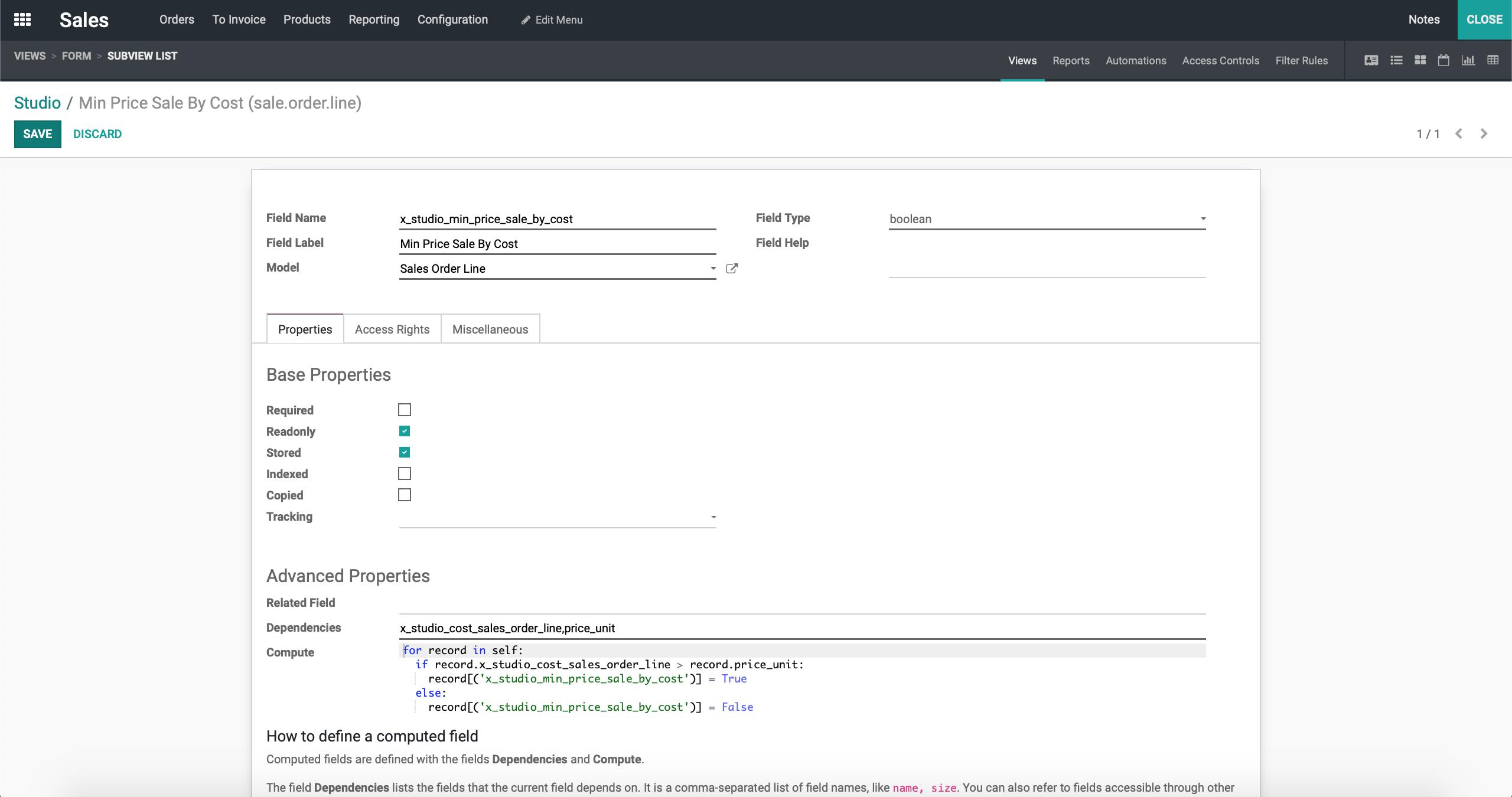 record['x_studio_check_min_cost'] = True在字段x_studio_check_min_cost的计算选项中,您可以看到高级属性头部,对吗?在依赖项字段中,将字段名设置为order_line,在计算字段中复制粘贴上述代码(注意缩进)。