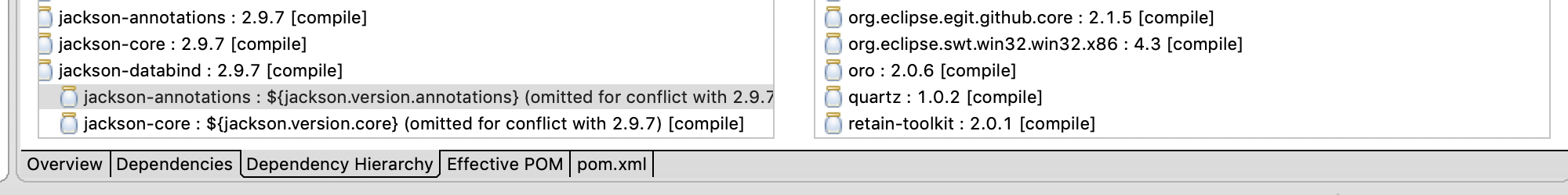 ERROR org.apache.maven.cli.MavenCli - Failed to execute goal on project cde-pilot: Could not resolve dependencies for project com.ibm:cde-pilot:jar:1.0-SNAPSHOT: Failed to collect dependencies at com.fasterxml.jackson.core:jackson-databind:jar:2.9.7 -> com.fasterxml.jackson.core:jackson-annotations:jar:${jackson.version.annotations}: Failed to read artifact descriptor for com.fasterxml.jackson.core:jackson-annotations:jar:${jackson.version.annotations}: Could not transfer artifact com.fasterxml.jackson.core:jackson-annotations:pom:${jackson.version.annotations} from/to artifactory-release (https://na.artifactory.blabla.com/artifactory/sysdse-maven-blabla): Illegal character in path at index 117: https://na.artifactory.blabla.com/artifactory/sysdse-maven-blabla/com/fasterxml/jackson/core/jackson-annotations/${jackson.version.annotations}/jackson-annotations-${jackson.version.annotations}.pom更新:我在我的Pom层次结构中发现了这个奇怪的设置。它显示出与版本有冲突。