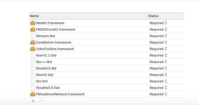 我认为您可以在下面添加屏幕截图的框架。当我之前更新Facebook时,新版本使用了一些新的API,需要新的框架依赖项。