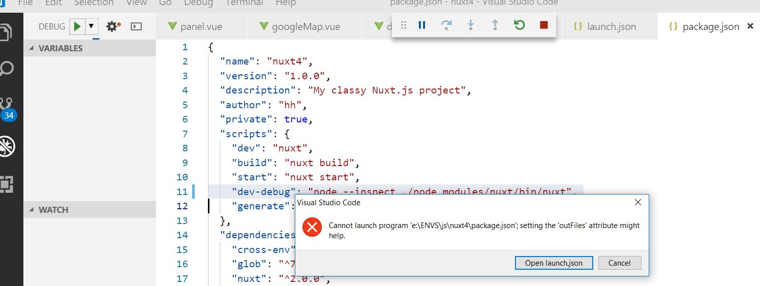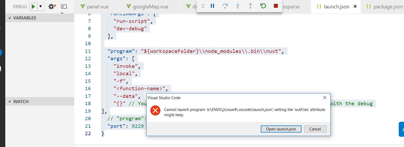 "dev-debug": "node --inspect ./node_modules/nuxt/bin/nuxt",关于错误消息“无法启动程序outFiles…设置‘无法在Visual代码中调试无服务器应用程序’属性可能有帮助”,"无法在Visual代码中调试无服务器应用程序“问题包括: