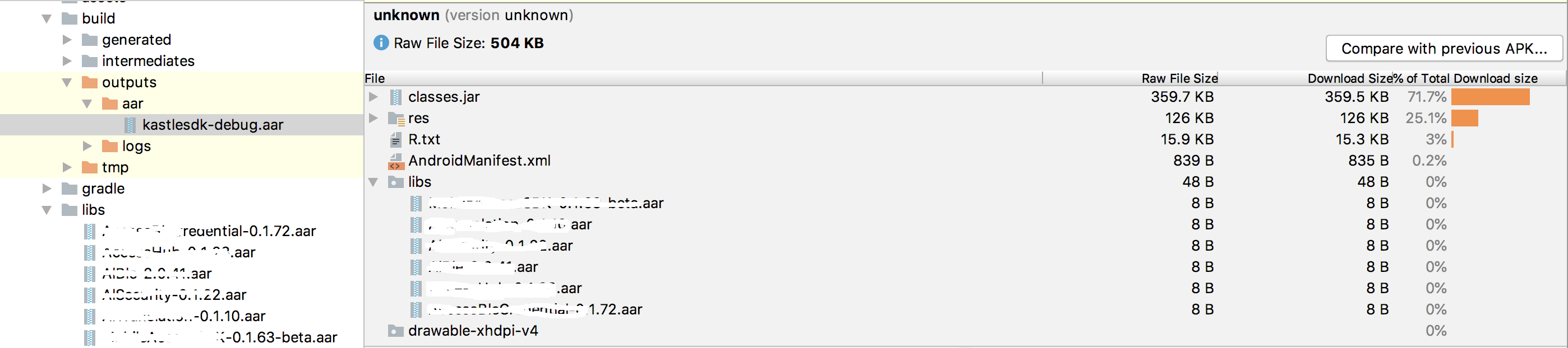 我创建了一个android库项目,并在lib文件夹中包含了一些第三方库(aar文件)。在生成库项目构建时,我在aar文件分析期间检查了它是否仍然包含lib文件夹中的所有第三方库,但它们的大小为0。我也得到了类,而不是第三方库类的异常。我尝试过调试和发布版本。我已将所有依赖项添加为