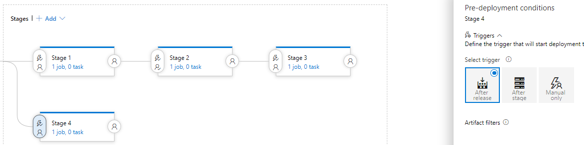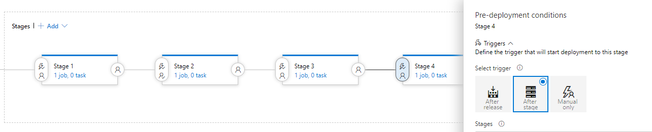 如果您想在第3阶段被取消或失败后继续自动部署stage4,那么将第4阶段独立于第3阶段,您可以在发布之后选择第4阶段的触发器为。