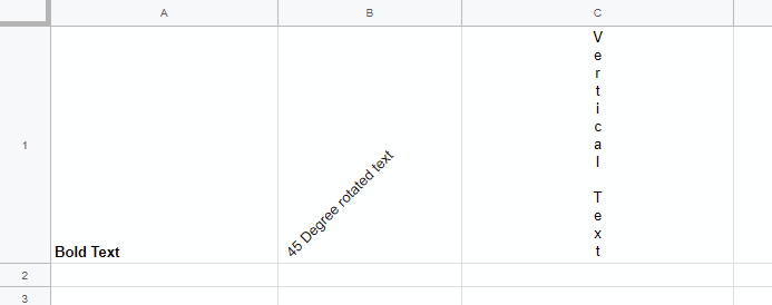 我正在尝试使用python中的pygsheets来旋转Google工作表中一些长标题名称的文本。下面的代码显示了对pygsheets中提供的示例的轻微修改,根据文档,这些示例应该可以工作。文本写入正确的单元格,单元格A1为粗体,但单元格B1和C1不旋转。没有出现错误消息。知道为什么这不管用吗?