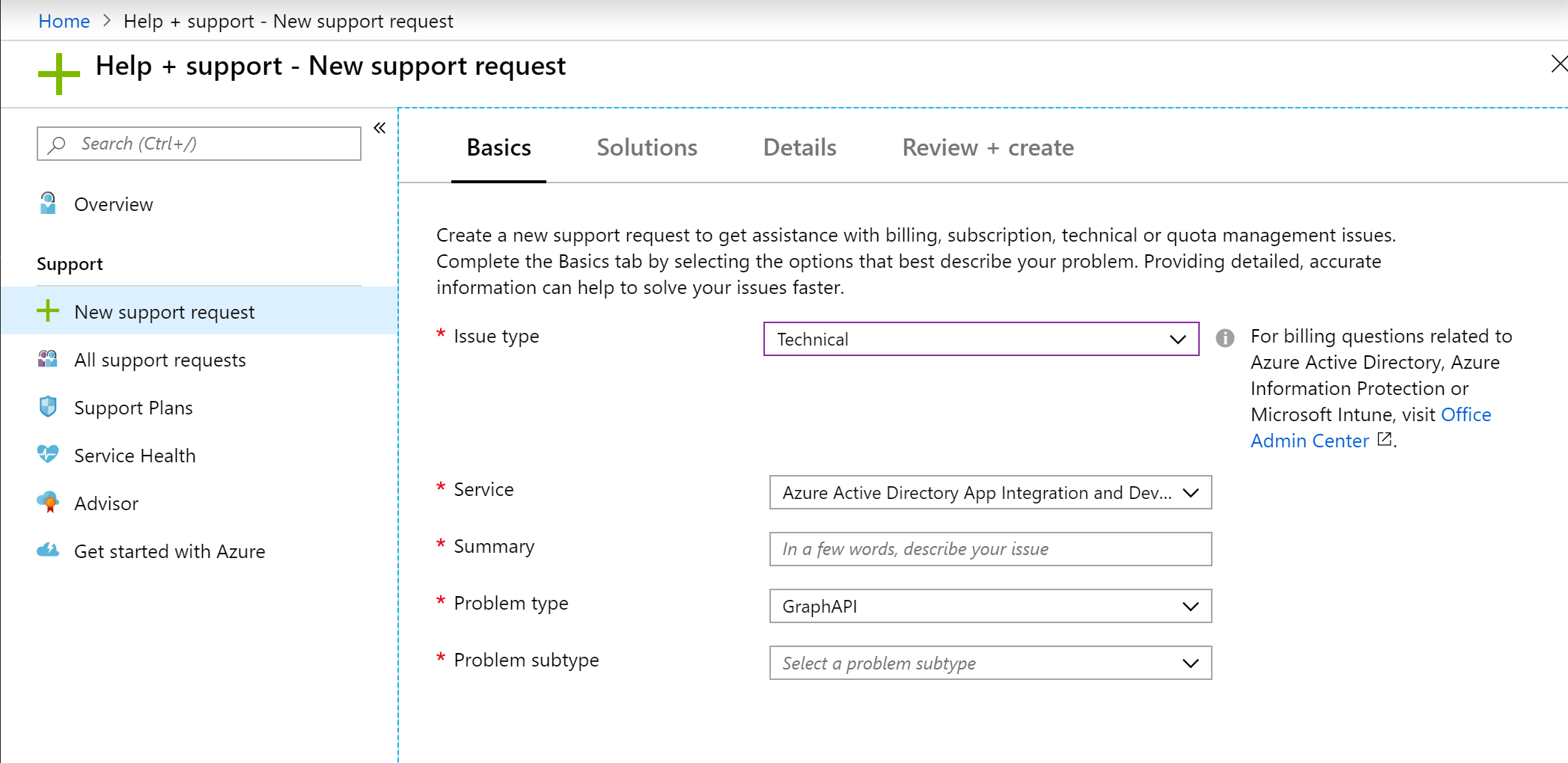 您可以在portal.azure.com中引发支持票。请单击“help+support”,然后选择“新支持请求”并选择“技术”,然后选择“Azure Active应用程序集成与开发”和“问题类型”作为GraphAPI。