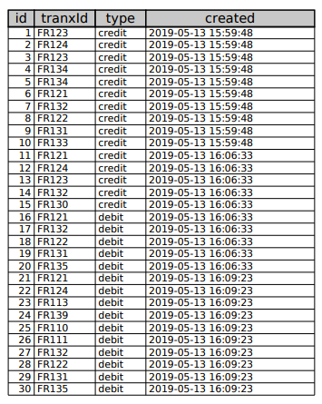 我有一个表"xyz",它有3列(id,tranxId,type),类型可以是信用或借方。