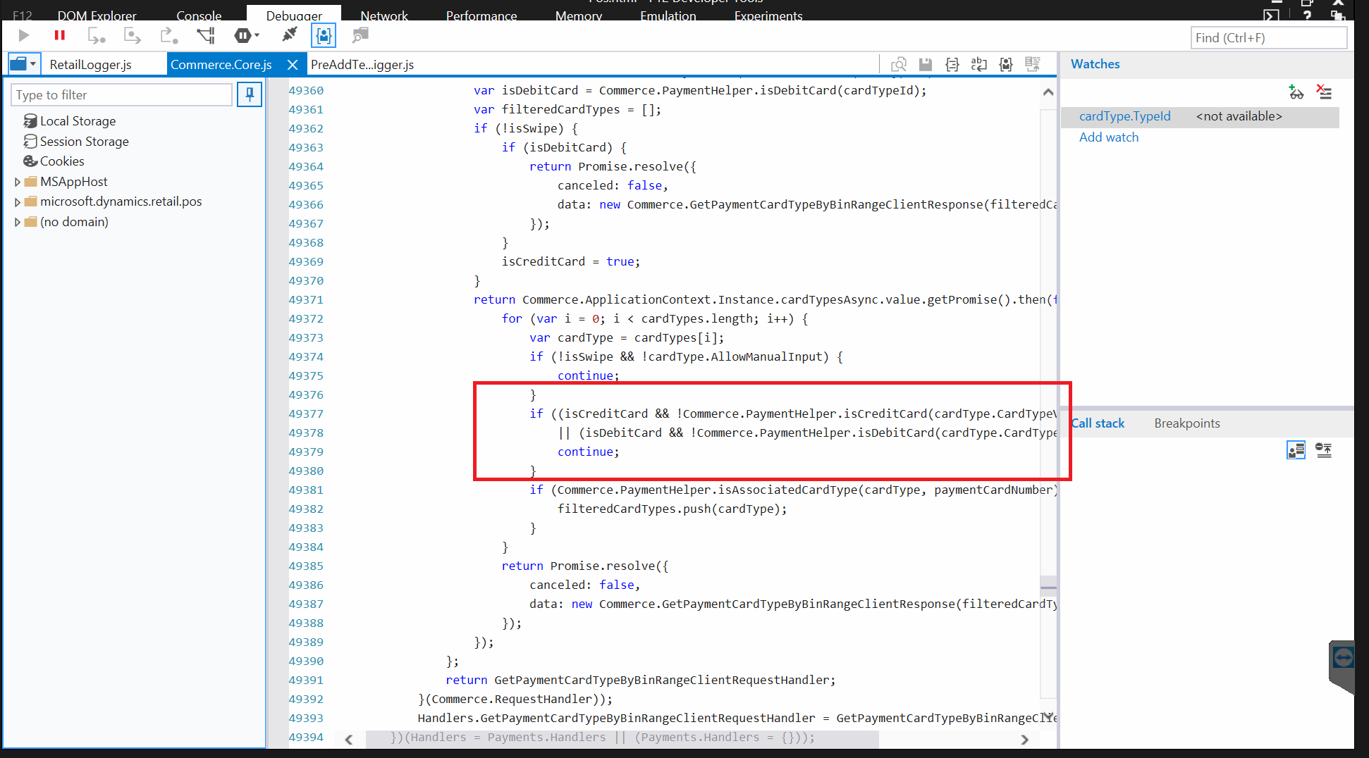在js文件"Commerce.Core.js“第49377行中,代码调用方法”Commerce.PaymentHelper.isCreditCard(.)“,检查信用卡。