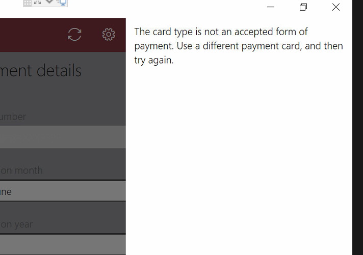 “卡类型不是公认的支付形式。请使用另一张支付卡,然后重试”