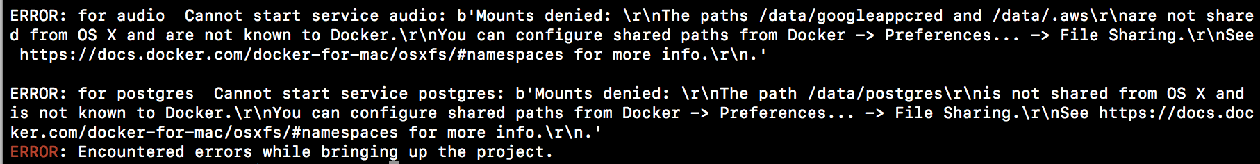 ERROR: for audio Cannot start service audio: b'Mounts denied: \r\nThe paths /data/googleappcred and /data/.aws\r\nare not shared from OS X and are not known to Docker.\r\nYou can configure shared paths from Docker -> Preferences... -> File Sharing.\r\nSee https://docs.docker.com/docker-for-mac/osxfs/#namespaces for more info.\r\n.'