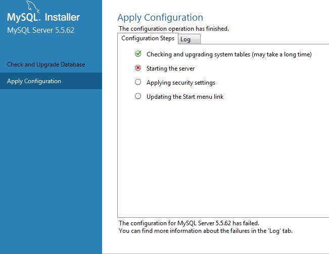 试图启动服务MYSQL55..。未能启动服务MYSQL55。等待建立到MySQL服务器5.5.62的连接(最多10次尝试).重试1:尝试用密码连接Mysql@localhost:3306和用户根.MySQL错误1042:无法连接到任何指定的MySQL主机。在下一次连接尝试前等待5秒钟.重试2:尝试用密码连接Mysql@localhost:3306和用户根.MySQL错误1042:无法连接到任何指定的MySQL主机。在下一次连接尝试前等待5秒钟.重试3:尝试用密码连接Mysql@localhost:3306和用户根.MySQL错误1042:无法连接到任何指定的MySQL主机。在下一次连接尝试前等待5秒钟.重试4:尝试用密码连接Mysql@localhost:3306和用户根.MySQL错误1042:无法连接到任何指定的MySQL主机。在下一次连接尝试前等待5秒钟.重试5:尝试用密码连接Mysql@localhost:3306和用户根.MySQL错误1042:无法连接到任何指定的MySQL主机。在下一次连接尝试前等待5秒钟.重试6:尝试用密码连接Mysql@localhost:3306和用户根.MySQL错误1042:无法连接到任何指定的MySQL主机。在下一次连接尝试前等待5秒钟.重试7:尝试用密码连接Mysql@localhost:3306和用户根.MySQL错误1042:无法连接到任何指定的MySQL主机。在下一次连接尝试前等待5秒钟.重试8:尝试用密码连接Mysql@localhost:3306和用户根.MySQL错误1042:无法连接到任何指定的MySQL主机。在下一次连接尝试前等待5秒钟.重试9:尝试用密码连接Mysql@localhost:3306和用户根.MySQL错误1042:无法连接到任何指定的MySQL主机。在下一次连接尝试前等待5秒钟.重试10:尝试用密码连接Mysql@localhost:3306和用户根.MySQL错误1042:无法连接到任何指定的MySQL主机。10次尝试后未能连接到MySQL服务器5.5.62。结束配置步骤:启动服务器