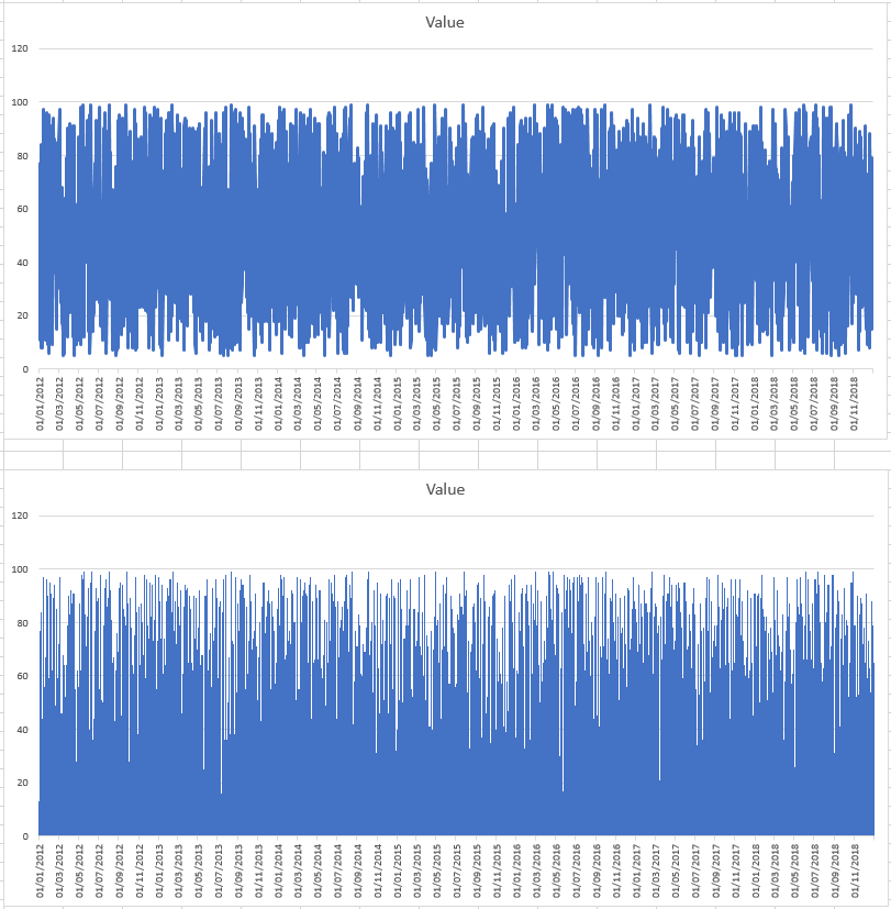 更新:比较而言,如果我获取数据并将其放入Excel中,则创建一个线条图和一个条形(“列”)图,它将立即转换该绘图,并保留线条图的轴标签。如果我试图用Python生成许多(数千)条形图,并使用多年的每日数据,这需要很长的时间。是否有一种在Python中进行Excel转换的等效方法?