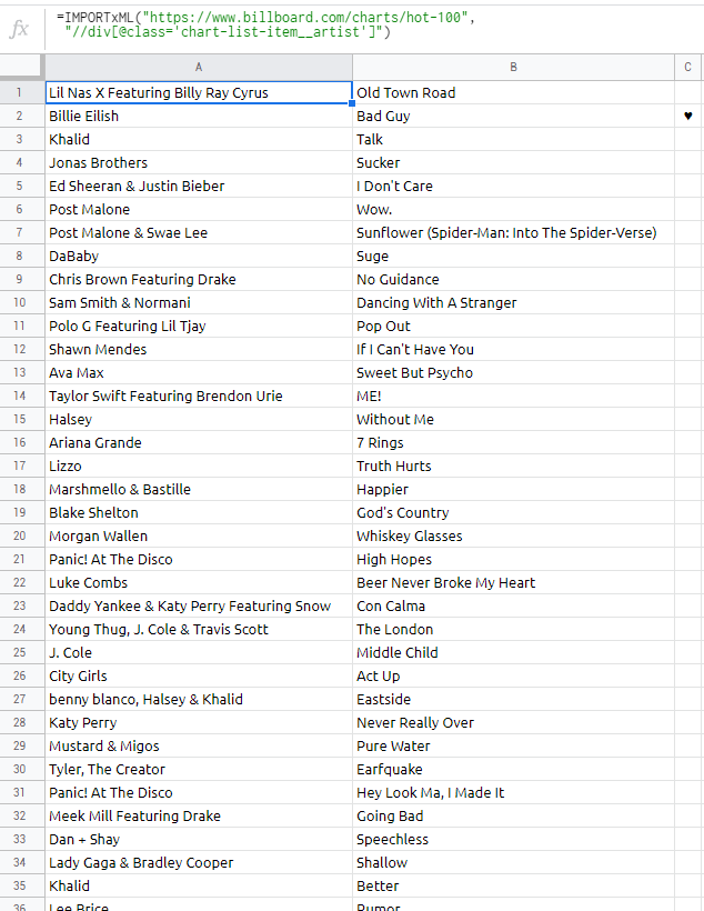 =IMPORTXML("https://www.billboard.com/charts/hot-100",