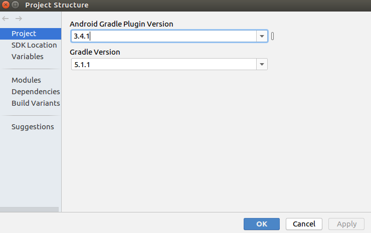 的Android插件版本和Gradle版本并不是最后一个版本,所以我使用了3.4.1和5.1.1 (File > Project > Project)。