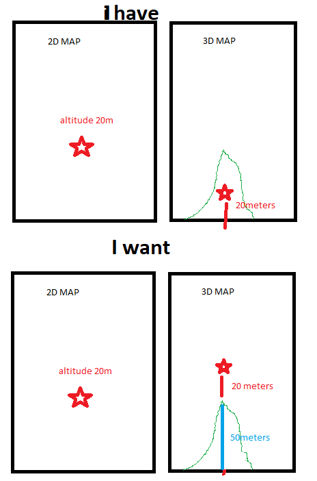 1)用户在二维平面图中将点高度设为20米。( 2)需要在现实世界的位置(长/拉)+ 20米(高度)创建点。( 3)点在三维地图上是可见的,所以在(长/拉)+ 20米(海拔)的位置。