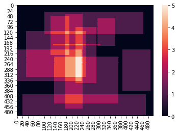 如果我正确理解,您有一个长度为M的数组n。M的每个元素,比如第一个元素M[0],都是一个四元素数组[x_1, y_1, x_2, y_2],它在更大的空间中定义了一个框。然后,这些盒子可以是重叠的,你想要的热量地图,是由所有这些盒子的整体组合/分层。