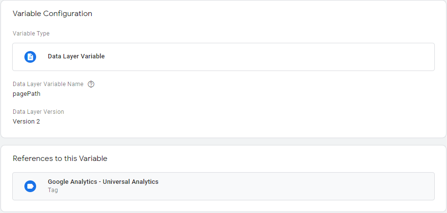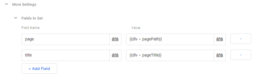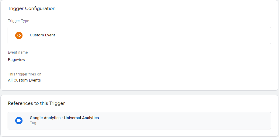 });我创建了pagePath和pageTitle dataLayer变量,并将它们分配给Google标签,还创建了一个自定义触发器PageView,并将其添加到Google标记中的触发器中。