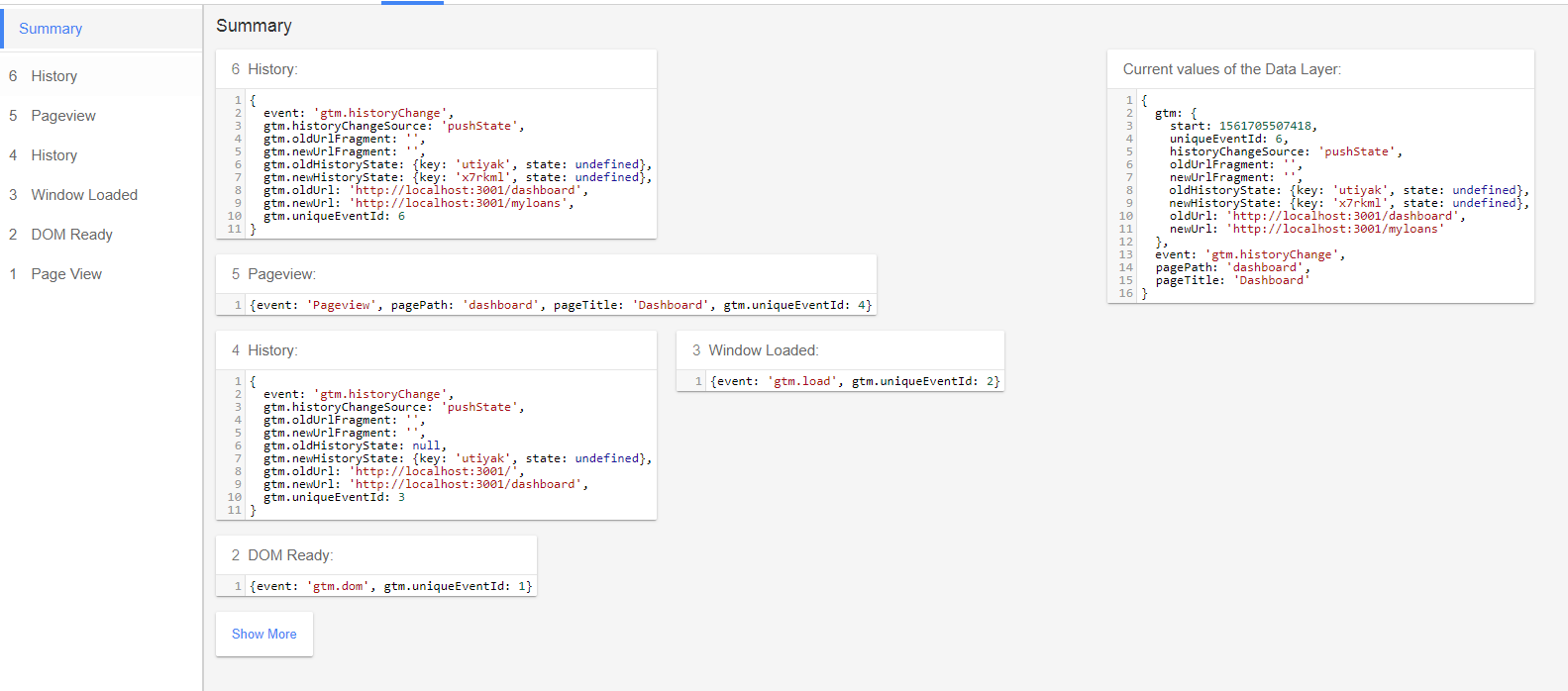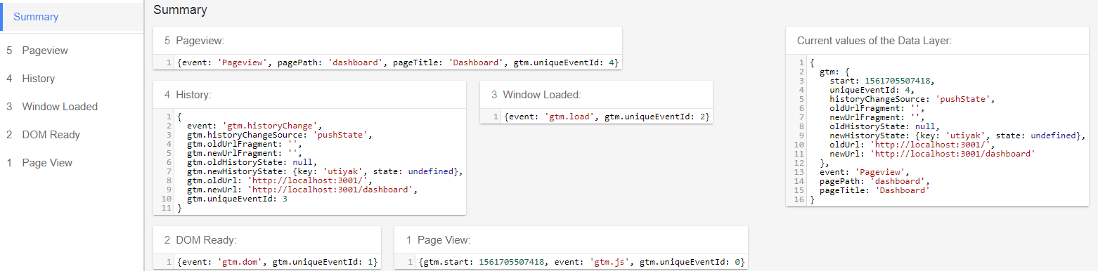 您用index.html编写的代码仅在页面加载时运行一次,如果要在页上注册事件,需要在要触发的路由上触发相同的事件,则可以从window访问dataLayer变量。