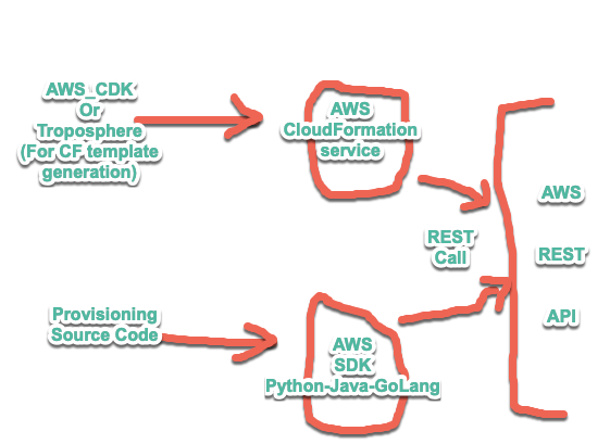 下面是我对使用SDK方法或CF模板生成工具(如CDK或对流层)与AWS (REST)对话的理解。