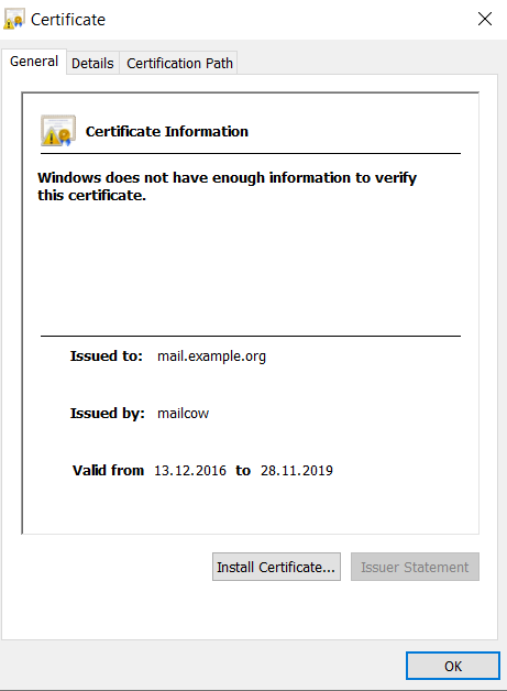 最近,在以下教程的帮助下,我设置了一个邮件服务器(邮件牛)。我尝试使用Outlook登录,但Outlook表示无法验证证书。为什么issued to字段的值是mail.example.org而不是xxx.xxx.xx