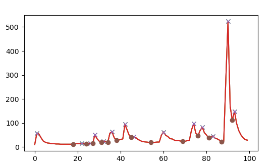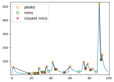 下面是用虚线表示的peaks、mins和peaks-closest mins对的图。请注意,有一些mins最接近多个peaks。
