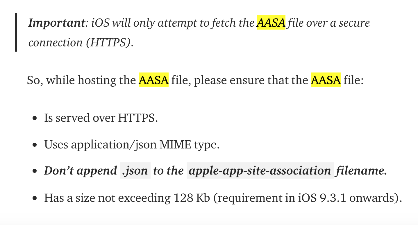 我试图在一个站点和我的应用程序之间建立一个通用链接,但是我意识到我的站点是在一个非安全连接(HTTP)上的。如果我想有一个通用链接到我的应用程序,AASA请求是否需要在一个安全连接(HTTPS)上?