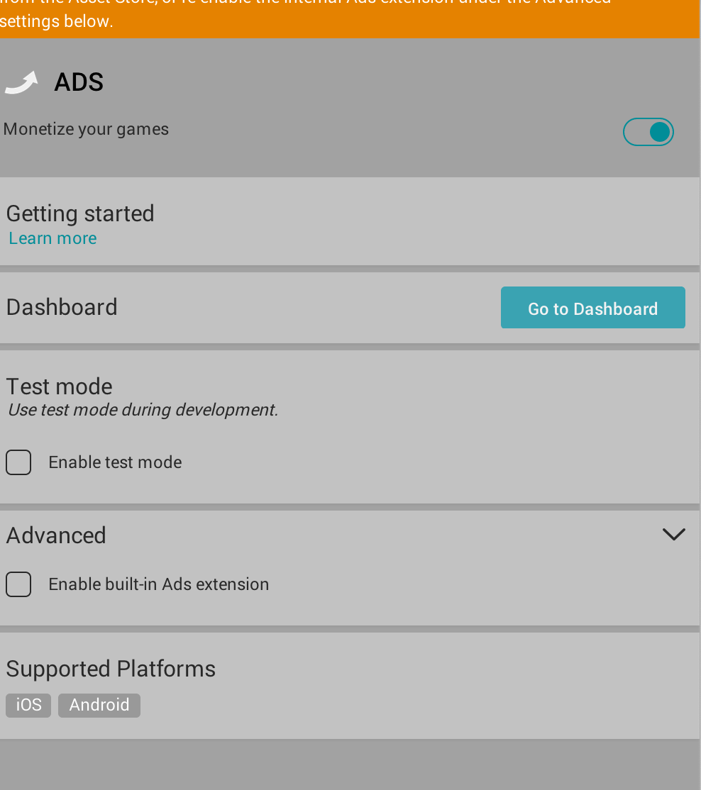 我有相同的问题,你有,你应该取消检查启用内置扩展为团结广告。我认为您手动添加了Unity,并签入了内置扩展。