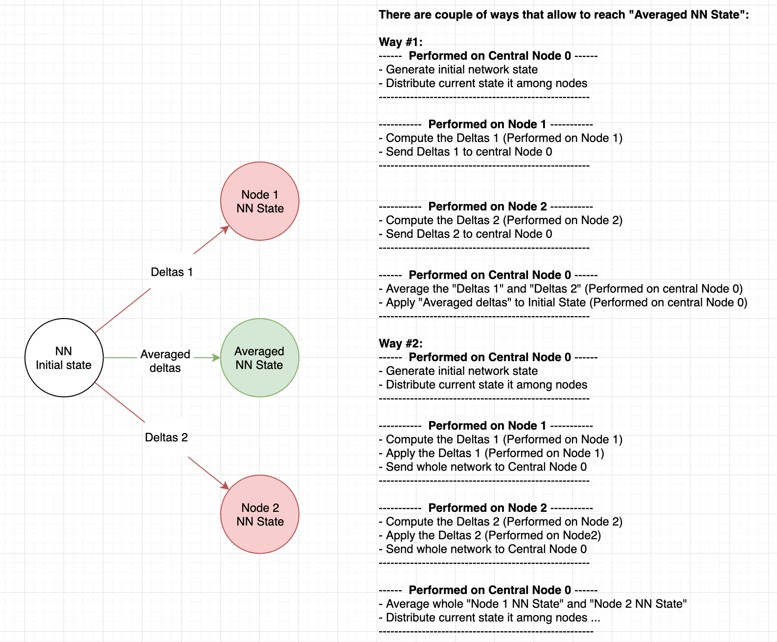 NN State = (0, 0) - (1, 0) = (-1, 0)现在,如果在节点上局部应用梯度,中心节点将对权重进行平均,而不是增量,则可以获得相同的结果:
