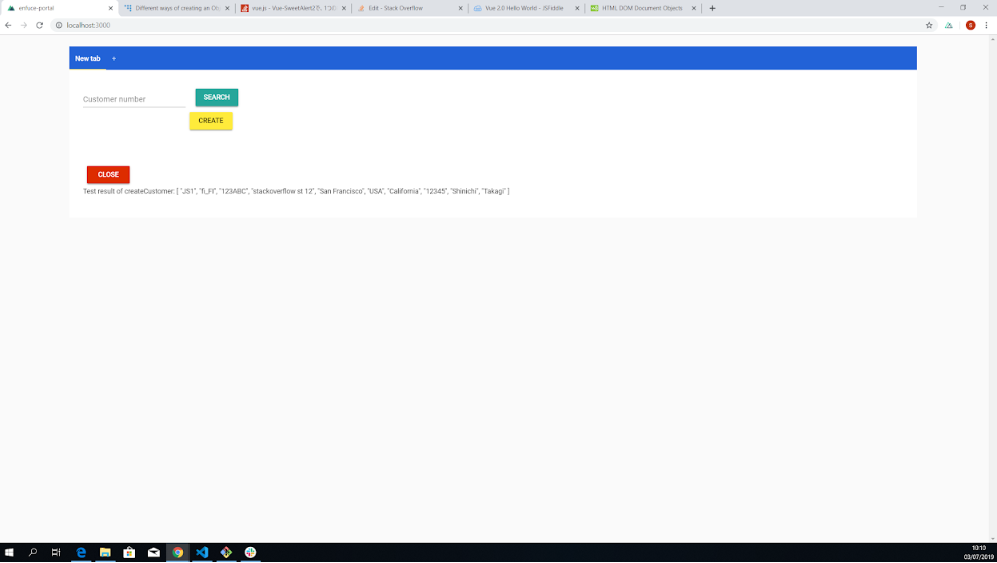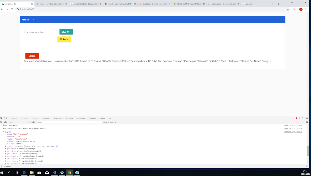 Test result of createCustomer: [ "JS1", "fi_FI", "123ABC", {"stackoverflow st 12", "San Francisco", "USA", "California", "12345"}, "Shinichi", "Takagi" ]发布于 2019-07-03 12:34:52