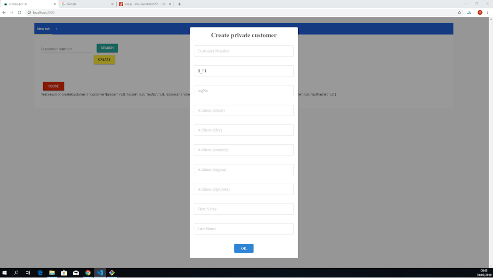 Test result of createCustomer: { "customerNumber": "JS1", "locale": "fi_FI", "regNo": "123ABC", "address": { "street": "stackoverflow st 12", "city": "San Francisco", "country": "USA", "region": "California", "zipCode": "12345" }, "firstName": "Shinichi", "lastName": "Takagi" }