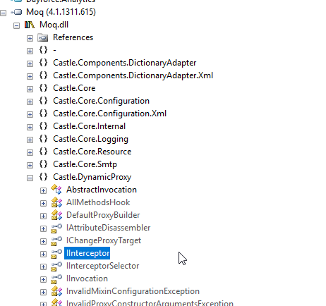 现在,我正在使用Castle.Core显式地创建一个动态代理(由于可见性范围减小,不能使用嵌入在Moq中的代码),因此代理实现了接口的Castle.Core风格。