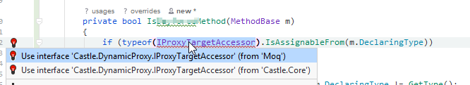 问题是Moq将Castle.Core代码嵌入其中(全部或部分,不确定),因此Castle.DynamicProxy.IProxyTargetAccessor在这两个程序集中都以public的形式出现。