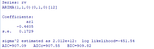 我在R中使用auto.arima预测一个金融变量,结果是一个ARIMA(1 1 0)(0 1 0) 12。