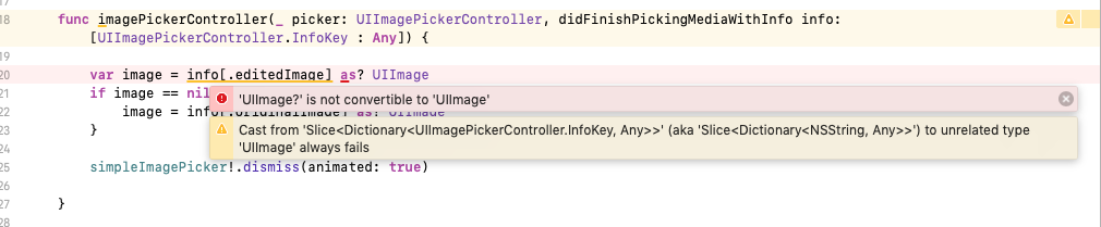 主要的问题是Swift 4中没有UIImagePickerController.InfoKey。编译器无法定义这种类型,如果您使用正确的签名(带有字符串),则会导致错误:任何字典,错误都会消失。
