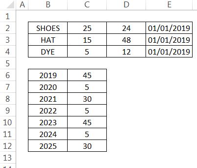 =SUMIF($D$2:$D$4, MOD(A7-YEAR($D$2:$D$4),($C$2:$C$4/12))= 0, $B$2:$B$4)基本上,我想说的是: