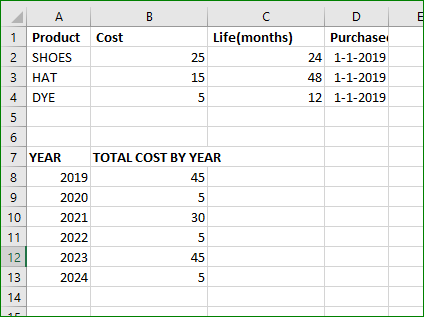 我试图创建一个电子表格,将跟踪当前和未来的成本项目已知的保质期。这包括产品是什么,产品的成本,产品的寿命(月)和最后一次购买的日期。