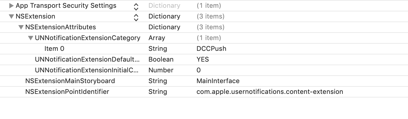 let deafultCategory = UNNotificationCategory(identifier: "DCCPush", actions: [], intentIdentifiers: [], options: [])