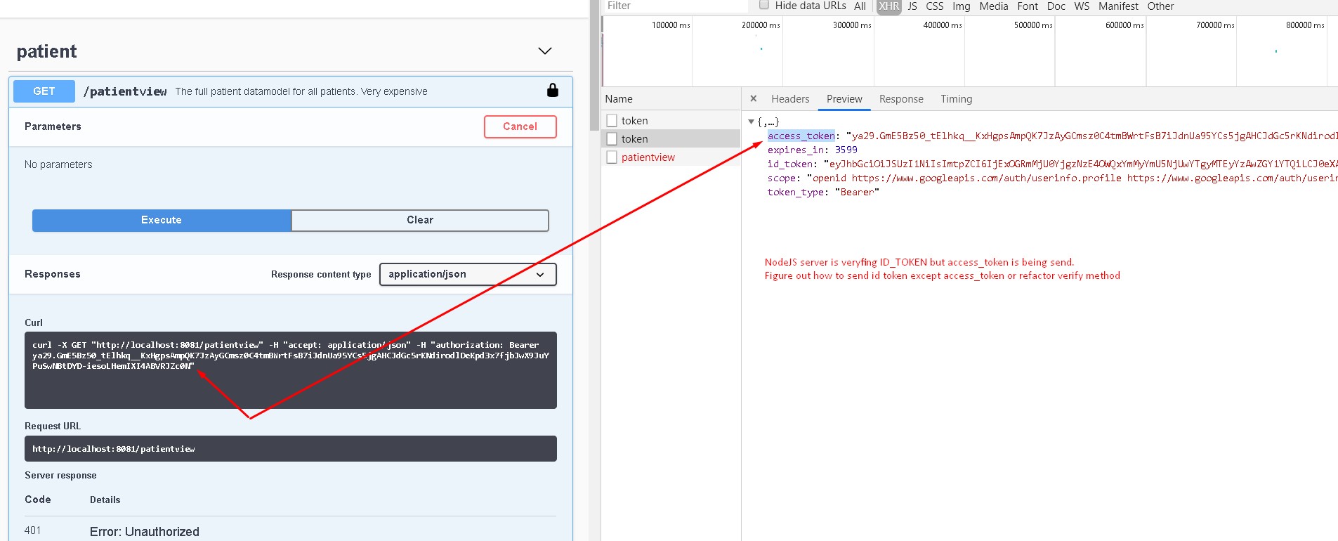 通过在安全配置中设置x-tokenName,可以使Swagger或Nswagg使用不同的令牌(id_token或access_token),如下所示: