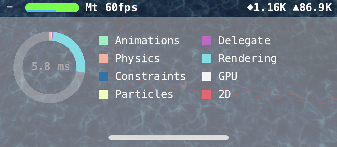 我正在开发一个3D游戏与ARKit和SceneKit。游戏运行平稳,以60 fps,但当我继续使用它一段时间,设备变得热和帧速率下降到30 fps。能量冲击很大,我在仪器上注意到了一些东西。我将展示统计数字和我在仪器上看到的。这是游戏顺利运行时的统计数据,但我不明白为什么当节点计数时,我得到1.16K。实际上,我使用的节点不多,但它只是一个简单的级别。
