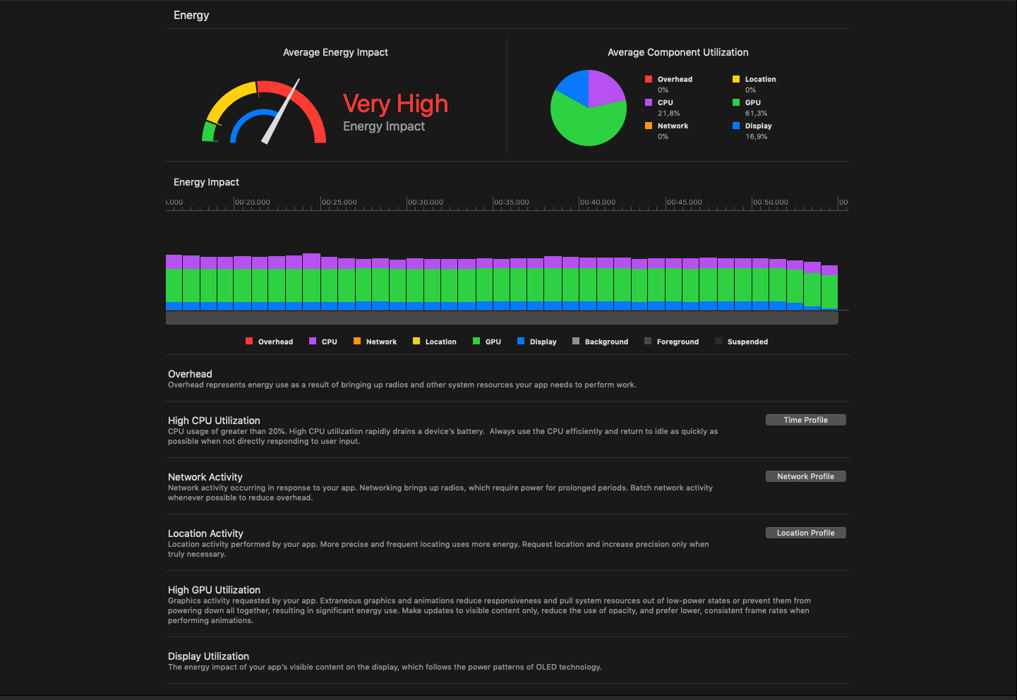 使用ARKit的6 DoF跟踪60 fps,以及SceneKit或RealityKit在60 fps的渲染(几何图形、PBR着色器和阴影),对处理器和图形单元来说是极其沉重的负担。它也消耗你的电池非常快,并使手机产生大量的热量。然而,对于AR、VR和AI应用程序来说,这是一个常见的问题。