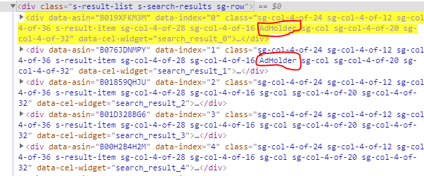我想,我有办法了。如果您查看其中一个页面,您可以看到(如果您搜索“s-结果-item”,即我们的response.css),结果包含一个名为"AdHolder“的文本。但是,我在我擦伤的结果里找不到.(见下图)