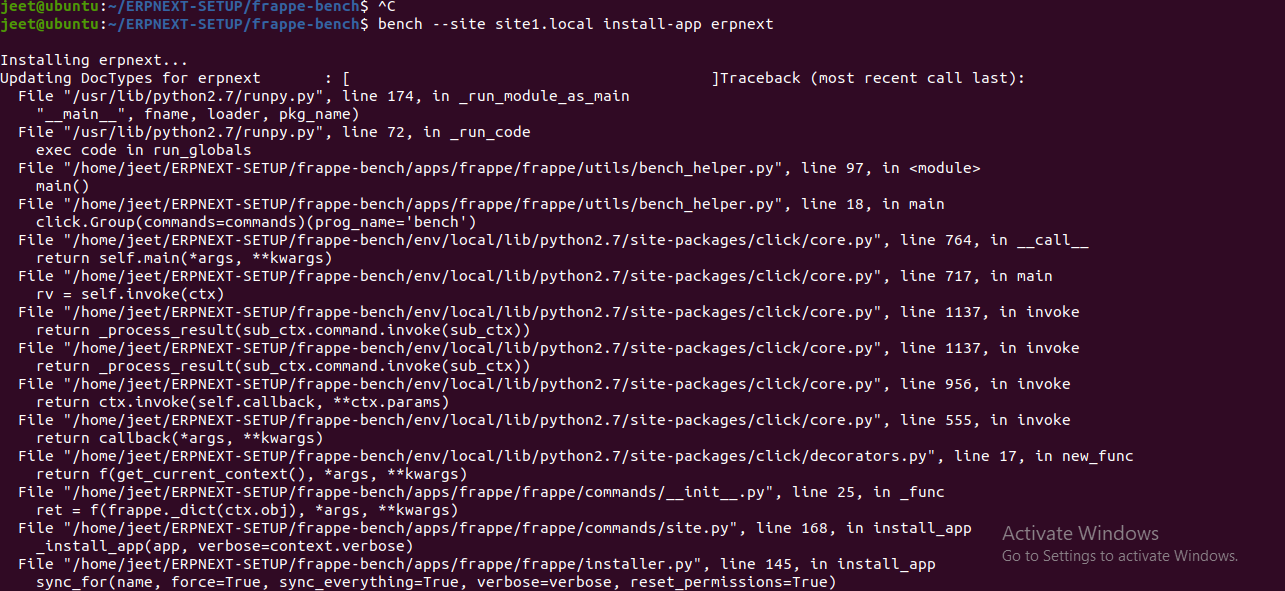 我正在尝试使用完全安装安装ERPNext frappe,但在执行工作台站点站点1.本地安装-app erpnext时会遇到以下问题