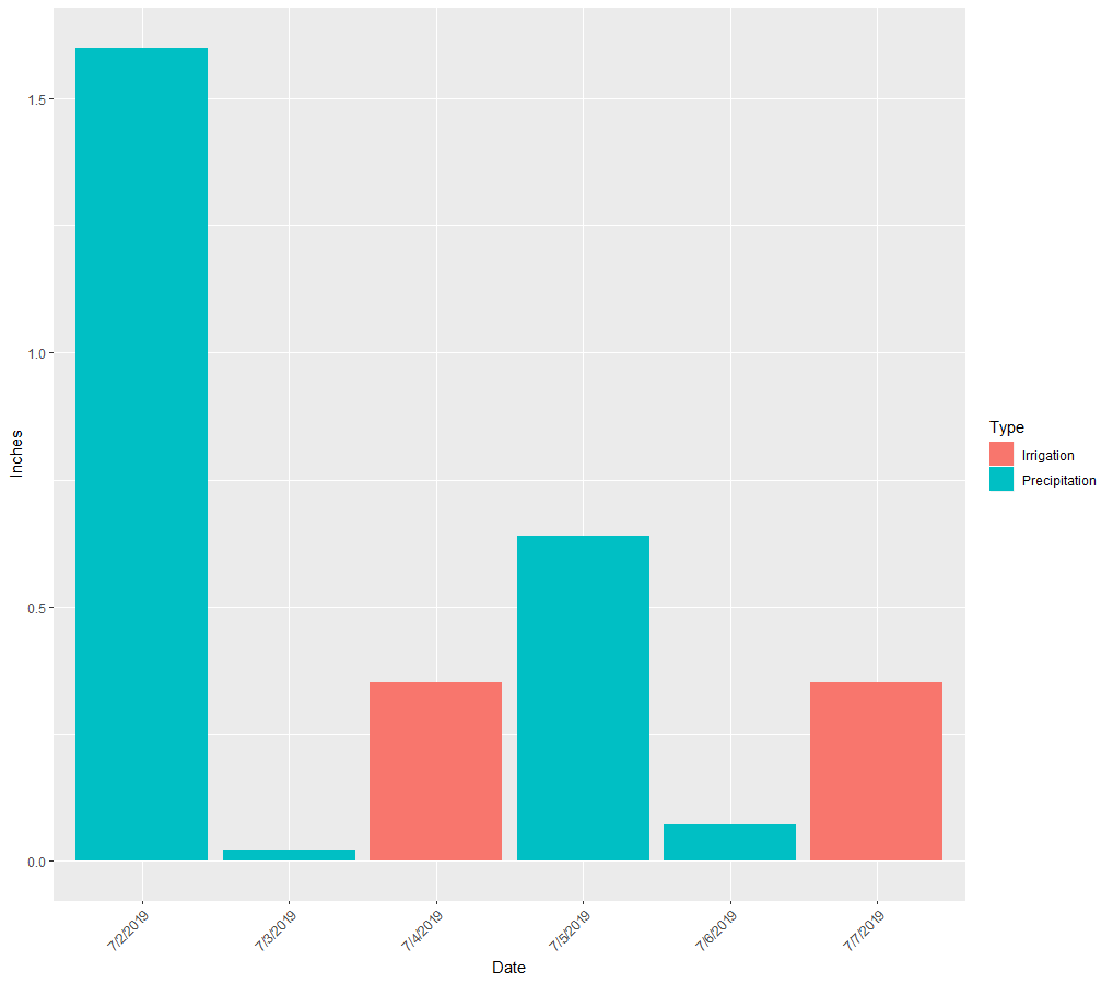 我希望这个标题不要太混乱。我有10个日期的数据,每个数据点都标为“灌溉”或“降水”。我想要制作一个条形图,它有一个按时间顺序排列的条形图,标有标有日期的条形图,但也希望条形图的颜色被编码(例如,“灌溉”中的所有条形图都是红色的,而来自“沉淀”的条形图则是蓝色的)。