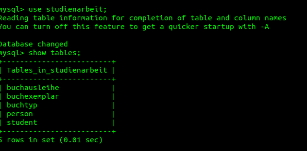 我执行了docker容器,并向我显示了数据库"studienarbeit“。但是,当我使用命令show表时,它告诉我数据库中没有表。