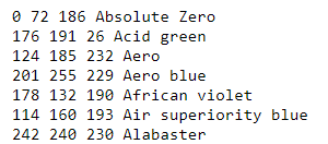 Very pale orange None期望的结果(只包括RGB值和用空格分隔的行中的名称):