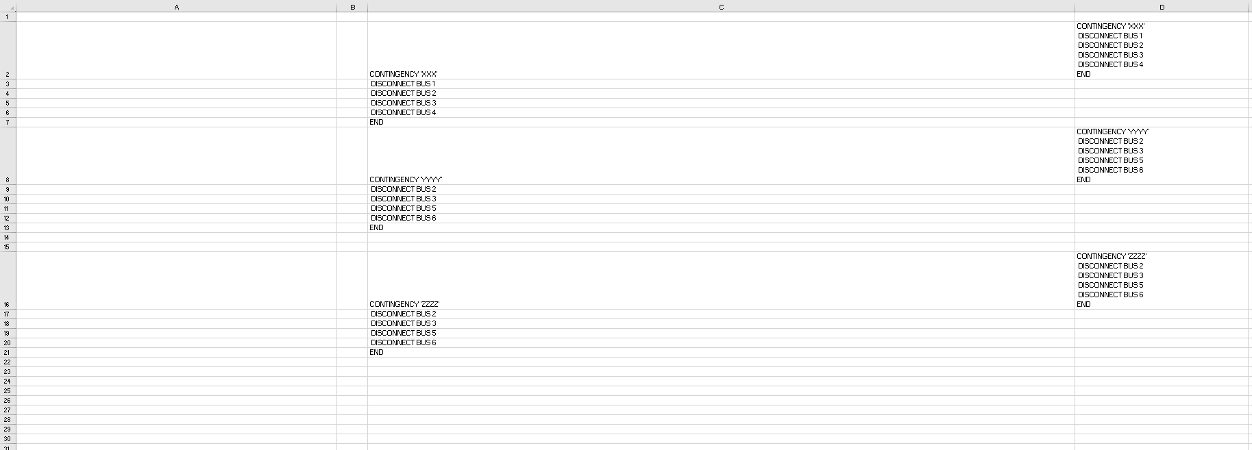 我想要的输出是这个CONTINGENCY 'XXX' DISCONNECT BUS 1 DISCONNECT BUS 2 DISCONNECT BUS 3 DISCONNECT BUS 4 END