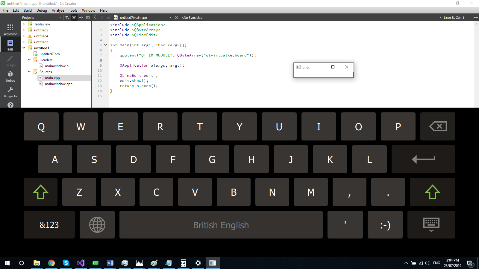 我将在基于小部件的应用程序中部署qtvirtualkeyboard,如下所示: