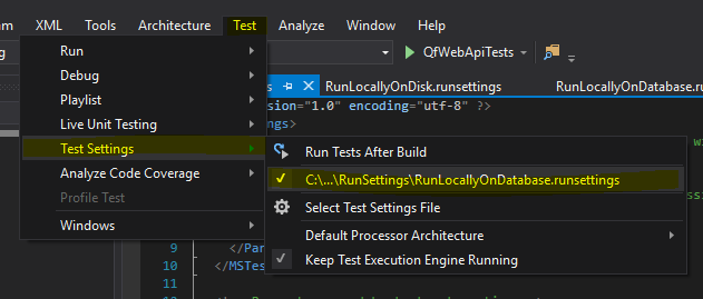 在VisualStudio2017企业中,通常可以在“测试”>“测试设置”下分配RunSettings文件: