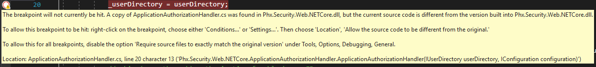 PdbNavigator: No debugging information found on symbol servers for Phx.Security.Web.NETCore, Version=1.0.0.0, Culture=neutral, PublicKeyToken=nullVS抱怨当我手动将断点添加到源文件时源代码是不同的: