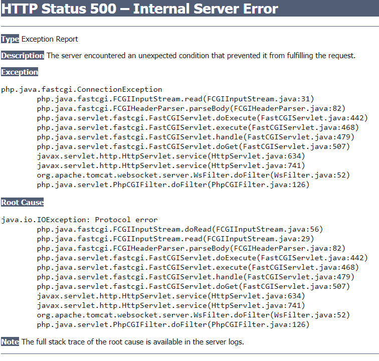25-Jul-2019 13:53:52.766 SEVERE [http-nio-8080-exec-8] org.apache.catalina.core.StandardWrapperValve.invoke Servlet.service() for servlet [PhpCGIServlet] in context with path [/JavaBridge] threw exception