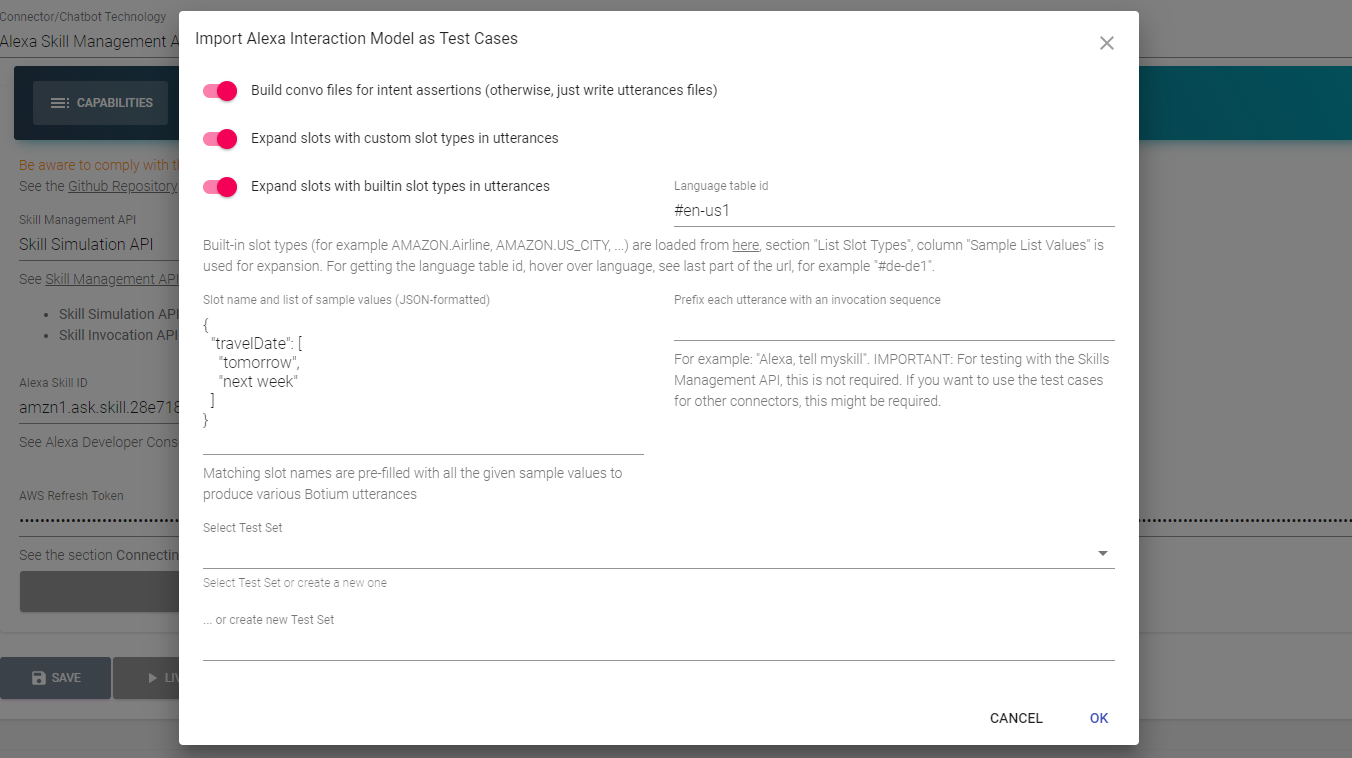 hello, meatbag!这是一个简单的测试案例,用户问bot hello,bot!,而bot应该用hello响应,肉袋!在BotiumScript中,机器人需要遵循的所有会话都是以会议形式编写的。为了让开始变得更容易,您可以导入Alexa技能交互模型,为您创建基本的测试用例: