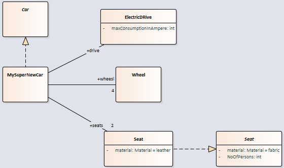 MySuperNewCar有一个带有4个轮子和2个皮革座椅的电动驱动器。我重复了这个图表中的抽象类。但这是不需要的(因为你可能已经猜到了)。